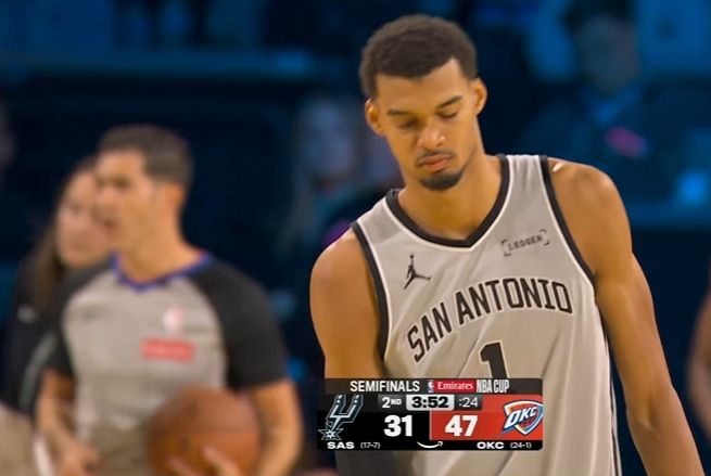 文班亚马时隔12场复出,且NBA生涯首次担任替补,他在首节未出战情况下,后三节用出色的攻防表现,率领马刺4人得分20+,惊险完成16分逆转终结雷霆16连胜,从而队史首次晋级NBA杯决赛。