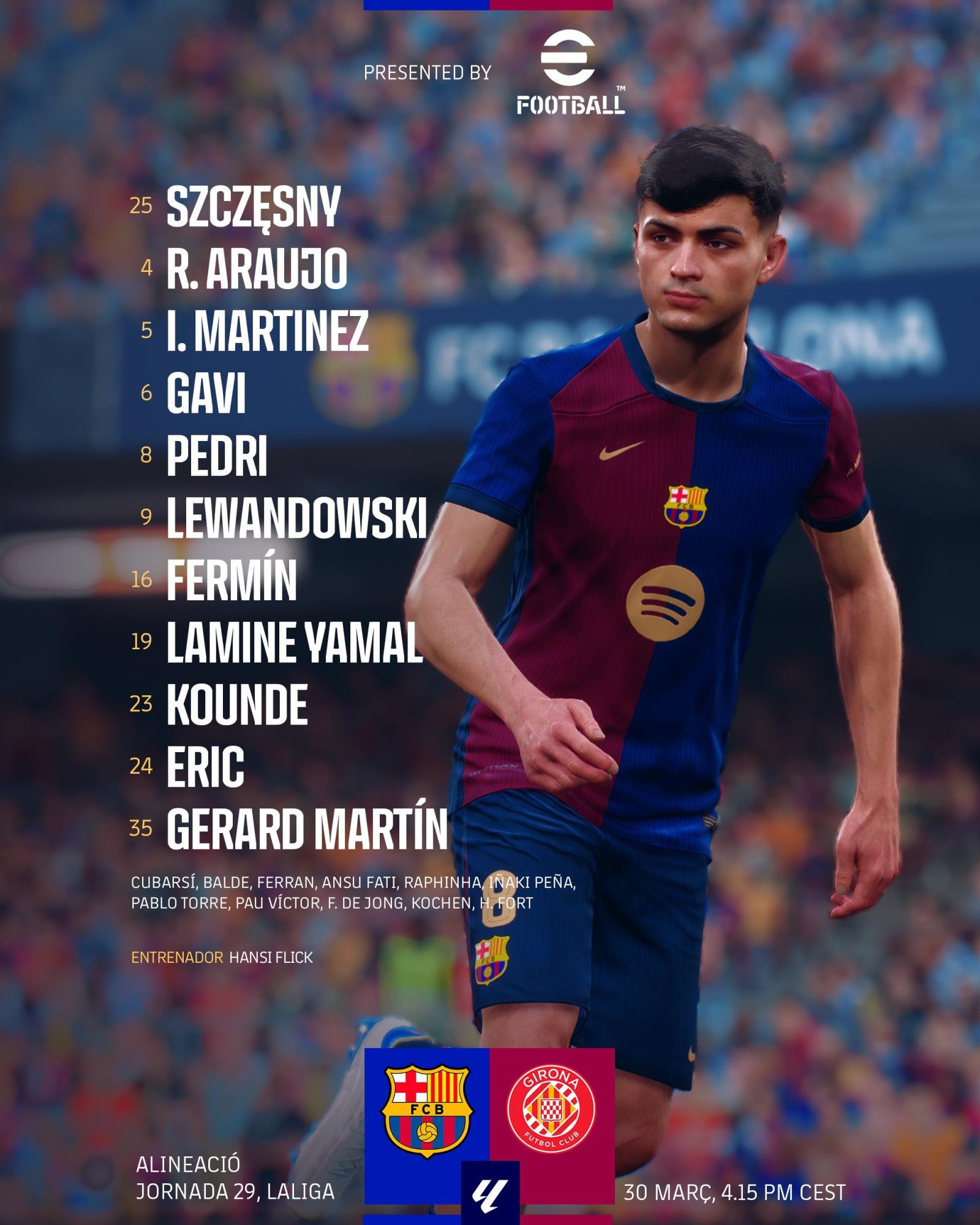巴萨首发:25-什琴斯尼、4-阿劳霍、5-伊尼戈-马丁内斯、23-孔德、24-埃里克-加西亚、35-杰拉德-马丁、6-加维、8-佩德里、16-费尔明、19-亚马尔、9-莱万